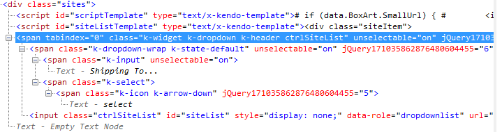I'm planning on using kendo ui with server-side javascript for rendering the page content such as NodeJS w/ JSDom. I've attached an example of a dropdownlist control that I'd be using on all/most pages. I need the ability to render the content into the DOM and conditionally displaying the dropdownlist rather than only rendering the dropdown onclick. We need the information written into the DOM so that portion of the DOM can be exposed to search engines crawling when the control is databound (not clicked). I've attached pictures of the IE and FF DOM after the control has been rendered as well.