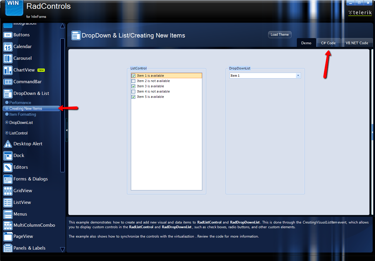 Private Sub ItemDataBound(ByVal sender As Object, ByVal args As ListItemDataBoundEventArgs) Private Sub ItemDataBinding(ByVal sender As Object, ByVal args As ListItemDataBindingEventArgs) Private Sub CreatingVisualListItem(ByVal sender As Object, ByVal args As CreatingVisualListItemEventArgs) Private Sub ItemDataBound(ByVal sender As Object, ByVal args As ListItemDataBoundEventArgs) Handles RadDropDownList1.ItemDataBound, RadListControl1.ItemDataBoundPrivate Sub ItemDataBinding(ByVal sender As Object, ByVal args As ListItemDataBindingEventArgs) Handles RadDropDownList1.ItemDataBindingPrivate Sub CreatingVisualListItem(ByVal sender As Object, ByVal args As CreatingVisualListItemEventArgs) Handles RadListControl1.CreatingVisualListItemI tried to modify the code but could not get the the check-box in the drop-down item ,while it does in the List-box