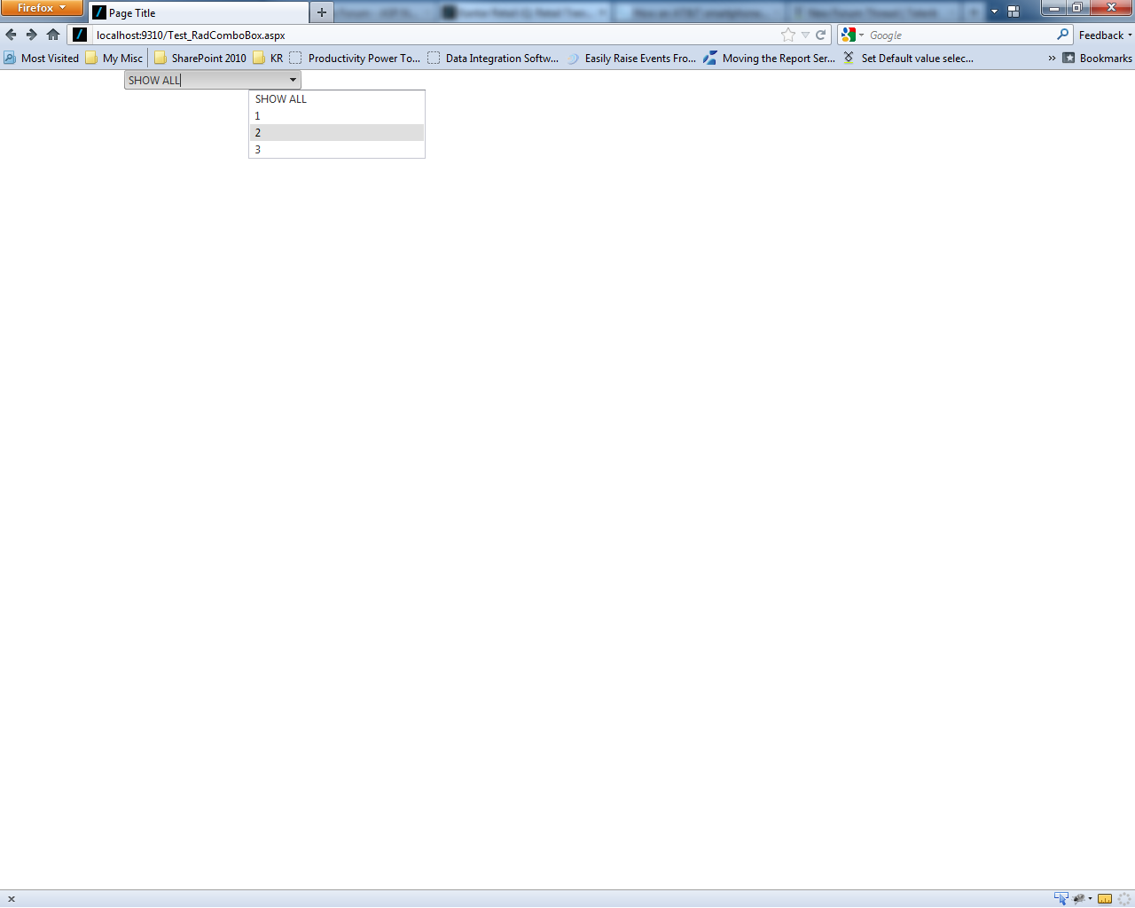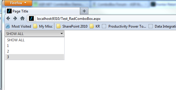 using System;using System.Collections.Generic;using System.Linq;using System.Web;using System.Web.UI;using System.Web.UI.WebControls;namespace KR.IQ{ public partial class Test_RadComboBox : System.Web.UI.Page { protected void Page_Load(object sender, EventArgs e) { FillRadComboBox(); } /// <summary> /// Sets up the featured insights control with the filter, default content types and homepage tag /// </summary> private void FillRadComboBox() { List<KeyValuePair<string, string>> filterItemList = new List<KeyValuePair<string, string>>() { new KeyValuePair<string, string>("One", "1"), new KeyValuePair<string, string>("Two", "2"), new KeyValuePair<string, string>("Three", "3") }; radComboBoxFIFilter.DataValueField = "key"; radComboBoxFIFilter.DataTextField = "value"; radComboBoxFIFilter.DataSource = filterItemList; radComboBoxFIFilter.DataBind(); } }}The problem is with page layouts that center the content of the body. This is done by a minimum of the following CSS styles on the body (included in my sample) but might be applied to an inner container: