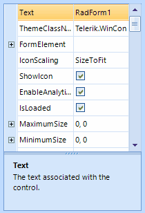 Sub New() InitializeComponent() Me.RadPropertyGrid1.SelectedObject = Me AddHandler Me.RadPropertyGrid1.EditorInitialized, AddressOf RadPropertyGrid_EditorInitialized AddHandler Me.RadPropertyGrid1.EditorRequired, AddressOf RadPropertyGrid1_EditorRequiredEnd SubPrivate Sub RadPropertyGrid_EditorInitialized(sender As Object, e As Telerik.WinControls.UI.PropertyGridItemEditorInitializedEventArgs) Dim editor As PropertyGridDropDownListEditor = TryCast(e.Editor, PropertyGridDropDownListEditor) If editor IsNot Nothing AndAlso e.Item.Label = "Text" Then Dim element As BaseDropDownListEditorElement = TryCast(editor.EditorElement, BaseDropDownListEditorElement) For index = 1 To 10 element.Items.Add("Item"&index) Next End IfEnd SubPrivate Sub RadPropertyGrid1_EditorRequired(sender As Object, e As PropertyGridEditorRequiredEventArgs) If e.Item.Label ="Text" Then e.EditorType= GetType(PropertyGridDropDownListEditor) End IfEnd SubI hope this information helps.