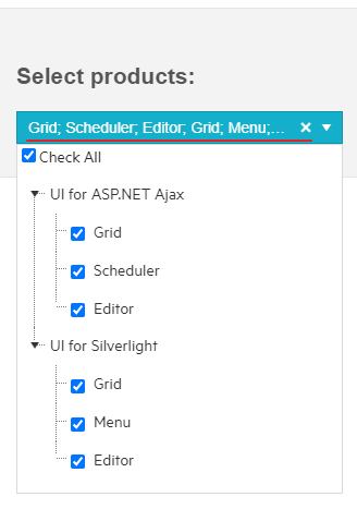 "X items checked".DisplayAllInInput—the text of all checked items is displayed in the input of the RadComboBox.