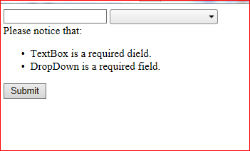 <asp:TextBox ID="TextBox1" runat="server"></asp:TextBox><asp:RequiredFieldValidator ID="RequiredFieldValidator2" ValidationGroup="Group1" runat="server" Display="None" ErrorMessage="TextBox is a required dield." ControlToValidate="TextBox1"></asp:RequiredFieldValidator><uc1:DropTree ID="DropTree1" runat="server" /><asp:RequiredFieldValidator ID="RequiredFieldValidator1" ValidationGroup="Group1" runat="server" Display="None" ErrorMessage="DropDown is a required field." ControlToValidate="DropTree1"></asp:RequiredFieldValidator><asp:ValidationSummary ID="ValidationSummary1" runat="server" ValidationGroup="Group1" DisplayMode="BulletList" ShowMessageBox="true" HeaderText="Please notice that:" /><asp:Button ID="btnSubmit" runat="server" Text="Submit" OnClick="btnSubmit_Click" />Thanks,
