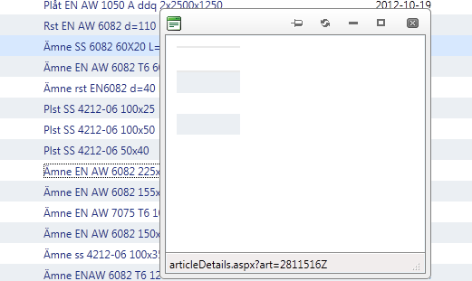 <telerik:RadWindowManager ID="RadWindowManager1" runat="server"> <Windows> <telerik:RadWindow ID="winArticle" runat="server"> </telerik:RadWindow> </Windows> </telerik:RadWindowManager><script type="text/javascript"> function openRadWin(art) { window.radopen('articleDetails.aspx?art=' + art, 'winArticle'); }</script><telerik:RadGrid ID="grArticles" runat="server" CellSpacing="0" GridLines="None" EnableEmbeddedSkins="False" Skin="Levweb" onneeddatasource="grArticles_NeedDataSource" AutoGenerateColumns="False" ondetailtabledatabind="grArticles_DetailTableDataBind" onprerender="grArticles_PreRender" onitemdatabound="grArticles_ItemDataBound"><MasterTableView DataKeyNames="as_artnr_6"><ExpandCollapseColumn Visible="True" FilterControlAltText="Filter ExpandColumn1 column" UniqueName="ExpandColumn1"> <HeaderStyle Width="20px"></HeaderStyle></ExpandCollapseColumn><DetailTables> <telerik:GridTableView DataKeyNames="art_artnr" Name="ArtDetails" Width="100%" ShowHeader="False"> <ExpandCollapseColumn Visible="True" FilterControlAltText="Filter ExpandColumn column"></ExpandCollapseColumn> <Columns> <telerik:GridBoundColumn SortExpression="art_artnr" HeaderText="art_artnr" HeaderButtonType="TextButton" DataField="art_artnr" Visible="false"> </telerik:GridBoundColumn> <telerik:GridBoundColumn SortExpression="text" HeaderText="text" HeaderButtonType="TextButton" DataField="text" UniqueName="text"> </telerik:GridBoundColumn> <telerik:GridBoundColumn SortExpression="art_ritning" HeaderText="art_ritning" HeaderButtonType="TextButton" DataField="art_ritning" UniqueName="art_ritning"> </telerik:GridBoundColumn> </Columns> </telerik:GridTableView></DetailTables><Columns> <telerik:GridTemplateColumn SortExpression="as_artnr_6"> <ItemTemplate> <asp:HyperLink ID="hlArtNr" Runat="server" Text='<%# DataBinder.Eval(Container, "DataItem.as_artnr_6") %>'></asp:HyperLink> </ItemTemplate> </telerik:GridTemplateColumn> <telerik:GridTemplateColumn SortExpression="ben_7"> <ItemTemplate> <asp:HyperLink ID="hlArtBen" Runat="server" Text='<%# DataBinder.Eval(Container, "DataItem.ben_7") %>'></asp:HyperLink> </ItemTemplate> </telerik:GridTemplateColumn> <telerik:GridDateTimeColumn DataField="levdat_3" DataFormatString="{0:yyyy-MM-dd}" FilterControlAltText="Filter column2 column" UniqueName="column2"> </telerik:GridDateTimeColumn> <telerik:GridNumericColumn DataField="rest_antal_4" DecimalDigits="2" DataFormatString="{0:0.#}" FilterControlAltText="Filter column3 column" UniqueName="column3"> </telerik:GridNumericColumn> <telerik:GridBoundColumn DataField="enhet_13" FilterControlAltText="Filter column4 column" UniqueName="column4"> </telerik:GridBoundColumn> <telerik:GridBoundColumn DataField="lev_artnr_10" FilterControlAltText="Filter column5 column" UniqueName="column5"> </telerik:GridBoundColumn> <telerik:GridBoundColumn DataField="ordernr_5" FilterControlAltText="Filter column6 column" UniqueName="column6"> </telerik:GridBoundColumn> <telerik:GridBoundColumn DataField="rad_status_20" FilterControlAltText="Filter column7 column" UniqueName="column7"> </telerik:GridBoundColumn> <telerik:GridBoundColumn DataField="hasChild" FilterControlAltText="Filter column7 column" UniqueName="hasChild" Visible="false"> </telerik:GridBoundColumn></Columns></MasterTableView><ClientSettings> <Selecting AllowRowSelect="true" /></ClientSettings></telerik:RadGrid>protected void grArticles_ItemDataBound(object sender, GridItemEventArgs e) { if (e.Item is GridDataItem) { HyperLink lbArtNr = (HyperLink)e.Item.Cells[3].FindControl("hlArtNr"); HyperLink lbArtBen = (HyperLink)e.Item.Cells[5].FindControl("hlArtBen"); lbArtNr.Attributes["href"] = "#"; lbArtNr.Attributes["onclick"] = "openRadWin('" + ((HyperLink)e.Item.Cells[2].Controls[1]).Text + "');"; lbArtBen.Attributes["href"] = "#"; lbArtBen.Attributes["onclick"] = "openRadWin('" + ((HyperLink)e.Item.Cells[2].Controls[1]).Text + "');"; } }