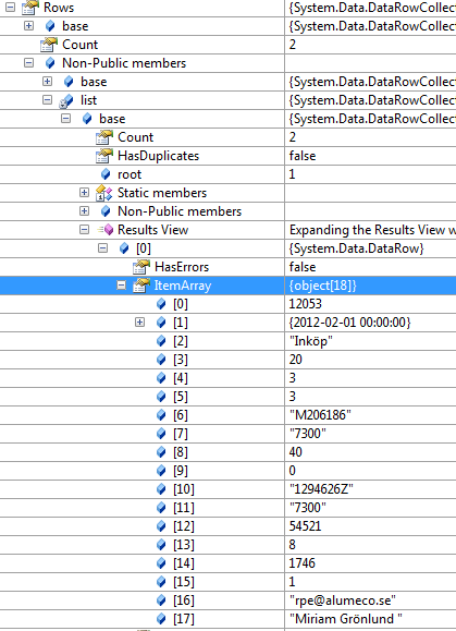 <telerik:RadGrid ID="grArtPlan" runat="server" CellSpacing="0" GridLines="None" EnableEmbeddedSkins="False" Skin="Levweb" onneeddatasource="grArtPlan_NeedDataSource" AutoGenerateColumns="False"><MasterTableView><Columns> <telerik:GridBoundColumn DataField="inlevdatum" FilterControlAltText="Filter column5 column" UniqueName="column5"> </telerik:GridBoundColumn> <telerik:GridBoundColumn DataField="ordernr" FilterControlAltText="Filter column5 column" UniqueName="column5"> </telerik:GridBoundColumn> <telerik:GridBoundColumn DataField="fsedel" FilterControlAltText="Filter column5 column" UniqueName="column5"> </telerik:GridBoundColumn> <telerik:GridBoundColumn DataField="levantal" FilterControlAltText="Filter column5 column" UniqueName="column5"> </telerik:GridBoundColumn></Columns></MasterTableView></telerik:RadGrid>protected void Page_Load(object sender, EventArgs e) { string art = Request.QueryString["art"]; } protected void grArtPlan_NeedDataSource(object sender, Telerik.Web.UI.GridNeedDataSourceEventArgs e) { LevWebService.SrvCoreClient service = new LevWebService.SrvCoreClient(); DataTable dt = service.ListaLagerPlanBild(((LevWebService.SessUser)Session[common.userSession]).Id, Request.QueryString["art"]); grArtPlan.DataSource = dt; }At this point i get all the relevent data into the datatable, but the rows generated looks empty (number of rows is drawn, but no data)