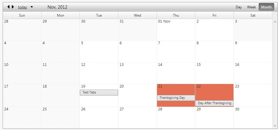 In Scheduler control, I found it is displaying duplicate day in month view. Nov 4 is displaying two times on sun and monday. Please see my attachment. But other months looks fine