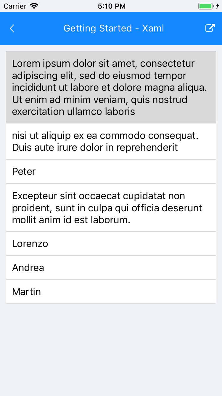 The first main row in the RadListView only shows a wrapped name, and is missing the second row of two Labels.