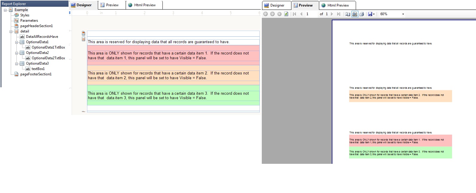 For each record, there are several data items that we may or may not want to display. They are the optional data panels. If they are not wanted, the visible property is set to false. That element then takes up no space. That works very well. But the problem is that the Detail section is a fixed size, taking up just as much space for each record, whether or not the record needs the space.