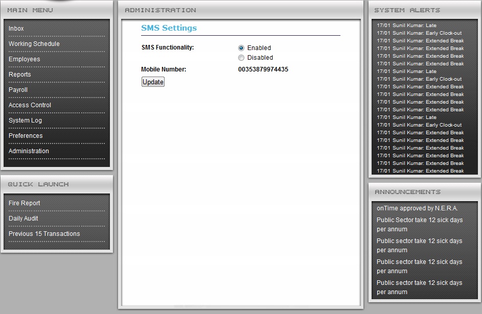 The aspx page has a menu on the left with links such as ADMINISTRATION, SYSTEM LOGS, USER PREFERENCES - If I click on Administration, the wuc_administration.ascx is loaded into Main_PH. I could have another 10 links from within administration.ascx - 1 in particular is the SMS settings page. Clicking on SMS settings loads: