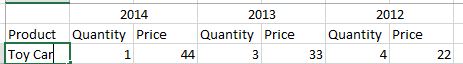 I was wondering how I can achieve dynamic multiple column headers. Currently I have a product followed by six columns , each a pair of Quantity and Price for past three years from selected year. I wish to group each Quantity & Price of each year under a title of the year . See example.