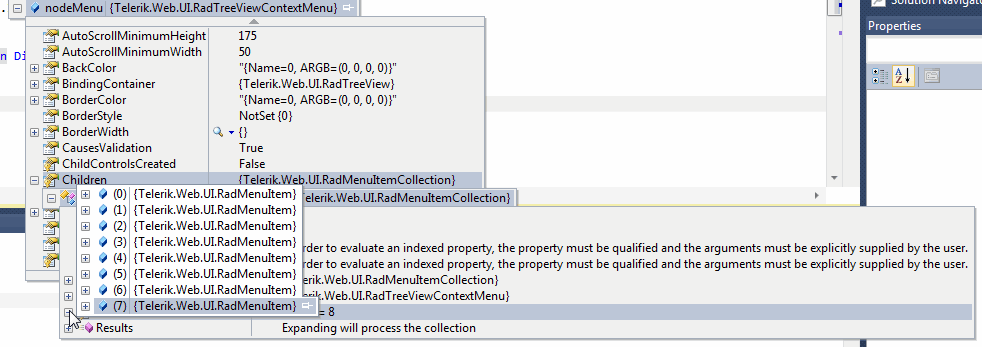 <telerik:RadTreeView ID="rtOutline" runat="server" AccessKey="w" CausesValidation="False" EnableDragAndDrop="True" EnableDragAndDropBetweenNodes="True" EnableViewState="True" CollapseAnimation-Type="None" ExpandAnimation-Type="None" OnNodeExpand="rtOutline_NodeExpand" > <ContextMenus> <telerik:RadTreeViewContextMenu ID="ElementMenu" runat="server" EnableAutoScroll="True"> </telerik:RadTreeViewContextMenu> </ContextMenus> <ExpandAnimation Type="None" /> </telerik:RadTreeView>As you can see I have subscribed to the Node Expand event of the server side. There is a lot of node building code in here so I won't post it all. however a single child node is successfully created (See image nodeDetail.gif). This image shows the Id from the menu