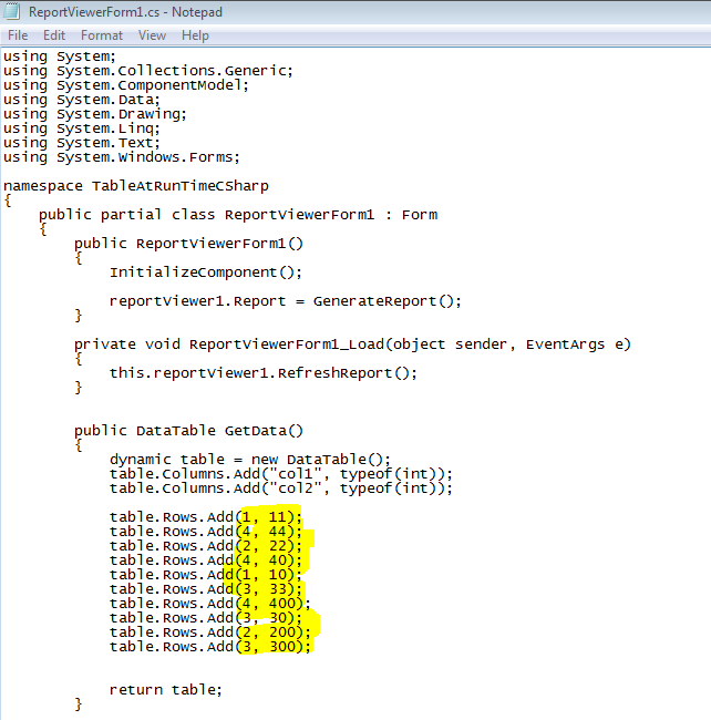 //add columns int cellOrder = 0; for (int i = 0; i <= data.Columns.Count - 1; i++) { if (data.Columns[i].ColumnName != "col1") { //add a column container table1.Body.Columns.Add(new Telerik.Reporting.TableBodyColumn(Telerik.Reporting.Drawing.Unit.Inch(2))); //add a static column group per data field Telerik.Reporting.TableGroup columnGroup = new Telerik.Reporting.TableGroup(); table1.ColumnGroups.Add(columnGroup); //header textbox Telerik.Reporting.TextBox headerTextBox = new Telerik.Reporting.TextBox(); headerTextBox.Name = "headerTextBox" + i.ToString(); headerTextBox.Size = new Telerik.Reporting.Drawing.SizeU(Telerik.Reporting.Drawing.Unit.Inch(2), Telerik.Reporting.Drawing.Unit.Inch(0.5)); headerTextBox.Value = data.Columns[i].ColumnName; headerTextBox.Style.BackgroundColor = Color.Yellow; headerTextBox.Style.BorderStyle.Default = Telerik.Reporting.Drawing.BorderType.Solid; // headerTextBox.Style.BorderWidth.Default = Telerik.Reporting.Drawing.Unit.Pixel(1); columnGroup.ReportItem = headerTextBox; //field that will be displayed Telerik.Reporting.TextBox detailRowTextBox = new Telerik.Reporting.TextBox(); detailRowTextBox.Name = "detailRowTextBox" + i.ToString(); detailRowTextBox.Size = new Telerik.Reporting.Drawing.SizeU(Telerik.Reporting.Drawing.Unit.Inch(2), Telerik.Reporting.Drawing.Unit.Inch(0.5)); detailRowTextBox.Value = "= Fields.[" + data.Columns[i].ColumnName + "]"; table1.Body.SetCellContent(0, cellOrder++, detailRowTextBox); //add the nested items in the Table.Items collection table1.Items.AddRange(new Telerik.Reporting.ReportItemBase[] { headerTextBox, detailRowTextBox }); } }To verify the dynamically generated structure, you can serialize it in XML and then store it in a TRDX file that can b previewed in the Standalone Report Designer.