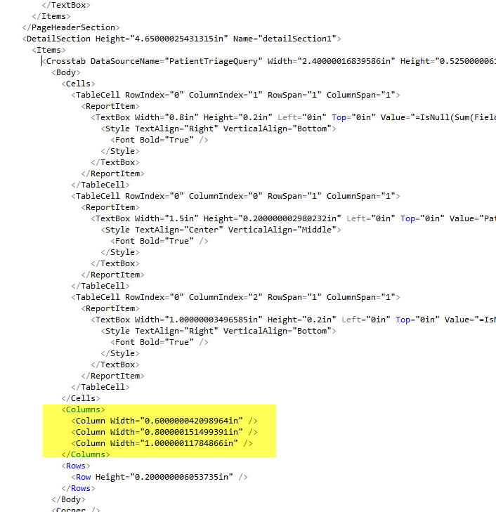 In the report designer the three columns are showing as 0.6in, 0.8in, and 1.0in