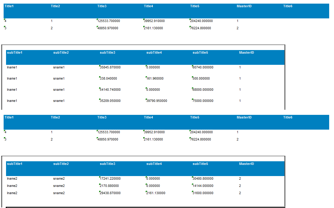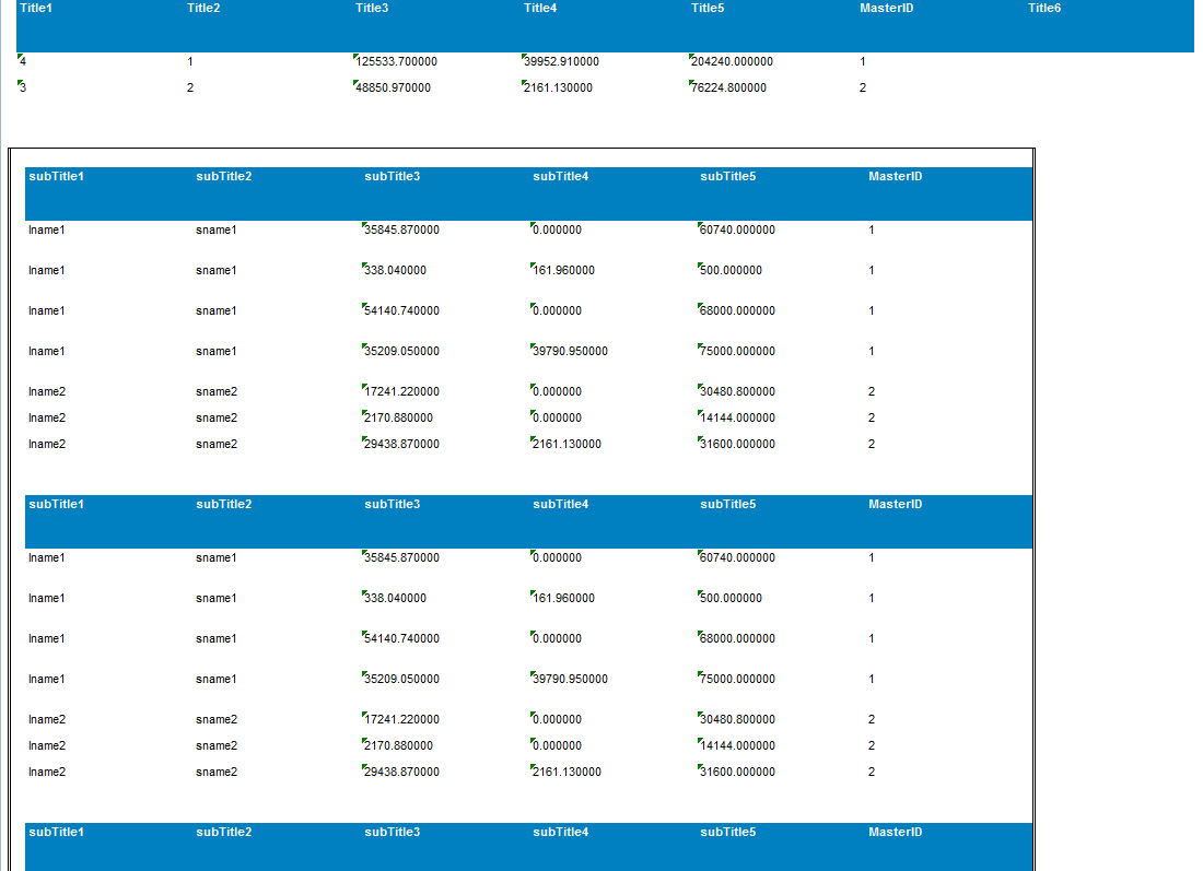 int i = 0; foreach (DataColumn dc in ds.Tables[0].Columns) { tableGroupColumn = new Telerik.Reporting.TableGroup(); this.table1.Body.Columns.Add(new Telerik.Reporting.TableBodyColumn(Unit.Inch(1))); textboxGroup = new Telerik.Reporting.TextBox(); textboxGroup.Value = dc.ColumnName.ToString(); textboxGroup.Size = new SizeU(Unit.Inch(1.1), Unit.Inch(0.3)); tableGroupColumn.ReportItem = textboxGroup; table1.ColumnGroups.Add(tableGroupColumn); textBoxTable = new Telerik.Reporting.TextBox(); table1.Body.SetCellContent(0, i++, textBoxTable); textBoxTable.Value = "=Fields." + dc.ColumnName; } Telerik.Reporting.TableGroup tableGroupRow = new Telerik.Reporting.TableGroup(); this.table1.RowGroups.Add(tableGroupRow); tableGroupRow.Grouping.Add(new Telerik.Reporting.Data.Grouping()); processingTable.DataSource = ds.Tables[0]; }Currently, I have the subreport added to the masterreport design but it produces the subreport tables at the bottom of the entire master report table. For each master table row, it prints the entire subreport table however many times a subreport row matches the parameter of the master row. It does this for each master row. (Used the parameter filter scheme from the following telerik site)
