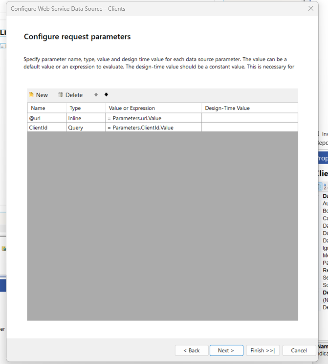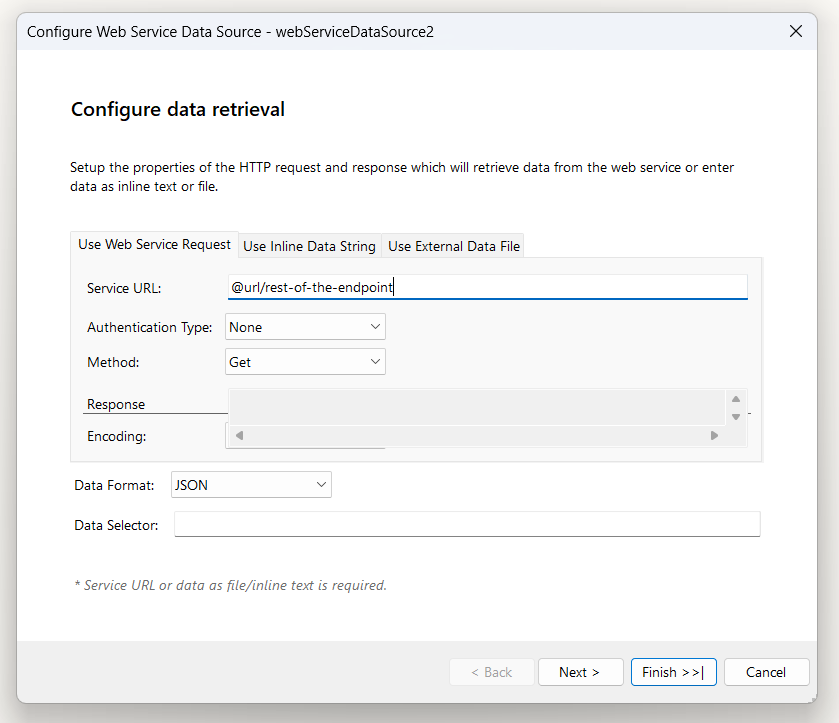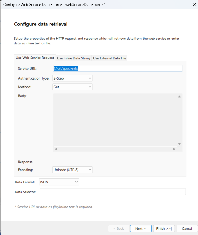 Scenario: My API domain is https://abcapi.com, which is used in every report under the "Configure Data Retrieval" window of the Web Service Data Source.