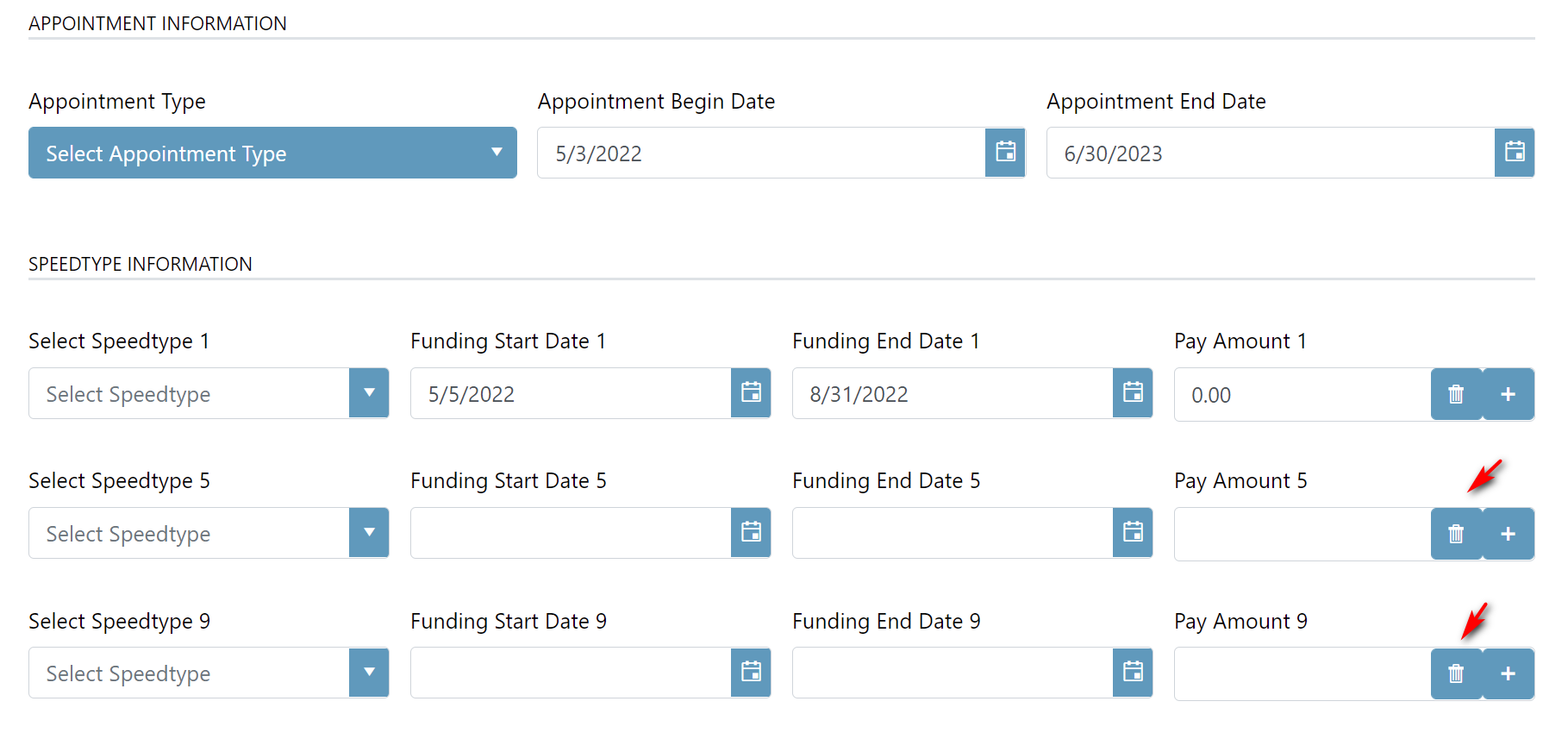 1) When creating the "remove" button for each input, assign an id to each button (i.e., "removeSpeedTypeBtn_{index}"). Then you can get the index of the element that should be removed in the "click" event handler of the button: