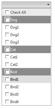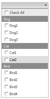 protected void Page_Load(object sender, EventArgs e) { Dictionary<string, List<string>> dicAnimal = new Dictionary<string, List<string>>(); List<string> list1 = new List<string>(); list1.Add("Dog1"); list1.Add("Dog2"); list1.Add("Dog3"); dicAnimal.Add("Dog", list1); List<string> list2 = new List<string>(); list2.Add("Cat1"); list2.Add("Cat2"); dicAnimal.Add("Cat", list2); List<string> list3 = new List<string>(); list3.Add("Bird1"); list3.Add("Bird2"); list3.Add("Bird3"); list3.Add("Bird4"); dicAnimal.Add("Bird", list3); RadComboBoxItem rcItem = new RadComboBoxItem(); foreach (string animal in dicAnimal.Keys) { rcItem = new RadComboBoxItem(); rcItem.IsSeparator = true; rcItem.Text = animal; RadComboBox1.Items.Add(rcItem); for (int i = 0; i < dicAnimal[animal].Count; i++) { rcItem = new RadComboBoxItem(); rcItem.Text = dicAnimal[animal][i]; RadComboBox1.Items.Add(rcItem); Label lbl = new Label(); lbl.Text = animal+(i+1); rcItem.Controls.Add(lbl); } } }<telerik:RadComboBox ID="RadComboBox1" runat="server" CheckBoxes="true"></telerik:RadComboBox>Hope this will be helpful.