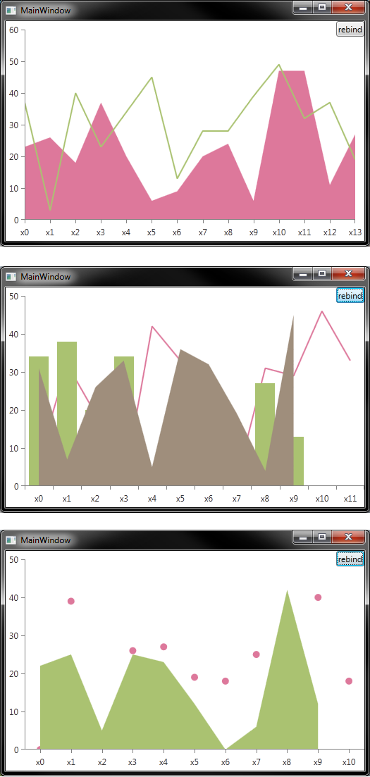 As for the last question, one series being on top of another - things are very simple. When you add series s2 after you have added series s1, the s2 series is drawn on top of s1. This is similar to how the rest of the framework works. If you want to see s1 on top of s2, I suggest you add s2 first and then add s1. If that is not possible for some reason, you can use the ZIndex property of the series. Note that this is not the Panel.ZIndex property, but a property of the series. So you can set a ZIndex 10 to the series you want on top.