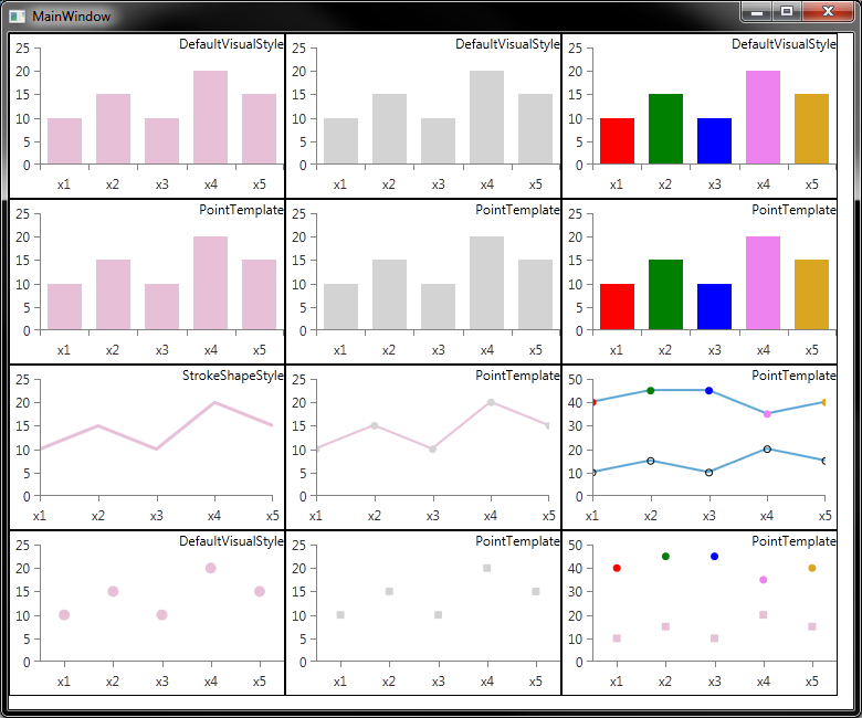 I have attached a simple project that demonstrates the use of the DefaultVisualStyle, StrokeShapeStyle and PointTemplate properties of the series. I have used BarSeries, LineSeries and PointSeries for this purpose. I hope that you will now fully understand how styling and templating works.