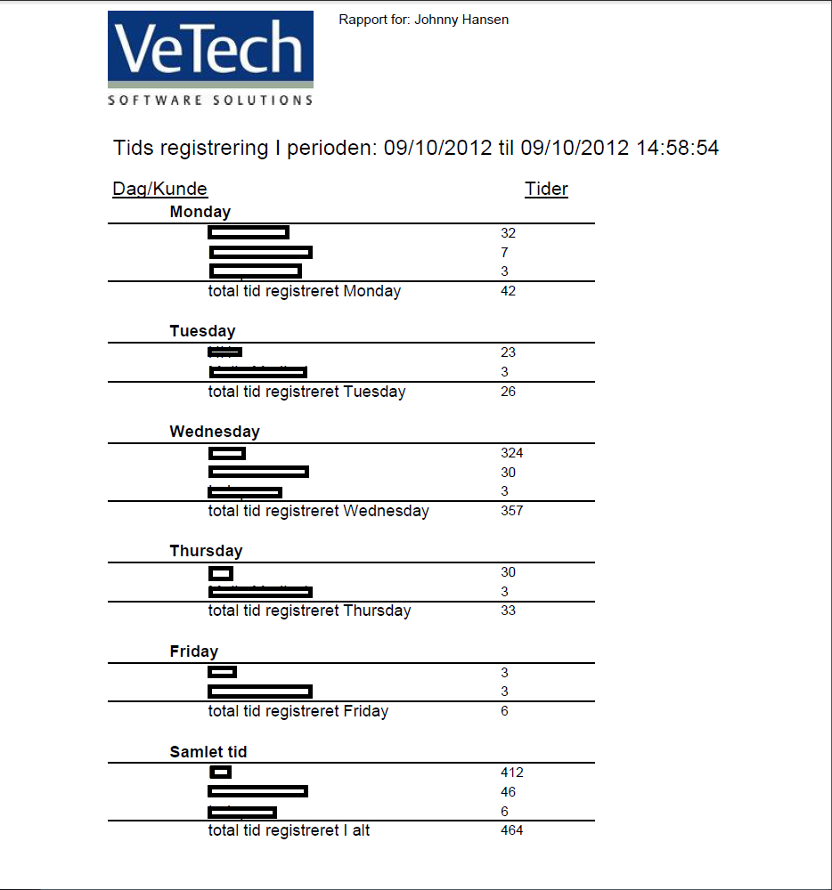 using System;using System.Collections.Generic;using System.Drawing;using System.Linq;using System.Text;using Telerik.Reporting;using Telerik.Reporting.Data;using Telerik.Reporting.Drawing;namespace TimeRegisterClient{ class ReportTableGenerator { public int CurrentRow { get; private set; } public int CurrentColumn { get; private set; } public int MaxColumns { get; private set; } public TextBox Nextbox { get; set; } private List<TextBox> nextRow { get; set; } private Table GeneratedTable; public Table table { get { if (isFinished) return GeneratedTable; return null; } private set { GeneratedTable = value; } } public Boolean isFinished { get; private set; } public Boolean ColumnsSet { get; set; } private List<ReportItemBase> tableItems { get; set; } public Unit DefaultRowHeight { get; set; } public ReportTableGenerator(Unit colHeight) { ColumnsSet = false; CurrentColumn = 0; CurrentRow = 0; MaxColumns = 0; DefaultRowHeight = new TextBox().Size.Height; RowGroup = new TableGroup(); tableItems = new List<ReportItemBase>(); GeneratedTable = new Table(); //GeneratedTable.Body.Rows.Add(new TableBodyRow(colHeight)); resetRow(); resetBoxes(); GeneratedTable.Name = "GeneratedTable"; } public ReportTableGenerator( SizeU size,PointU location,Unit columnheight):this(columnheight) { setDimensions(size,location); } public void finishTable() { GeneratedTable.Items.AddRange(tableItems.ToArray()); GeneratedTable.RowGroups.Add(RowGroup); RowGroup.Grouping.AddRange(new Grouping[] { new Grouping("") }); RowGroup.Name = "DetailGroup"; isFinished = true; } private void resetRow() { nextRow=new List<TextBox>(); } public void resetBoxes() { Nextbox = new TextBox(); } public void setDimensions(SizeU size, PointU location) { GeneratedTable.Location = location; GeneratedTable.Size = size; } public void addRowCell() { nextRow.Add(Nextbox); resetBoxes(); } public void appendRow() { int dif = nextRow.Count - (MaxColumns+1); if (dif > 0) throw new Exception("you added " + dif + " more cells to a row than possible"); if (!ColumnsSet) { ColumnsSet = true; completeColumns(); } GeneratedTable.Body.Rows.Add(new TableBodyRow(DefaultRowHeight)); TableGroup newGroup = new TableGroup(); RowGroup.ChildGroups.Add(newGroup); foreach (TextBox t in nextRow) { if (t.Name.Equals("")) t.Name = CurrentRow + "," + CurrentColumn; addCell(t); } resetRow(); } private void addCell(TextBox t) { GeneratedTable.Body.SetCellContent(CurrentRow,CurrentColumn,t); iterateCell(); tableItems.Add(t); } public void addColumn(Unit Width) { if(ColumnsSet) throw new Exception("You cannot add anymore columns at the given time"); GeneratedTable.Body.Columns.Add(new TableBodyColumn(Width)); TableGroup cgroup = new TableGroup(); MaxColumns++; cgroup.ReportItem = Nextbox; GeneratedTable.ColumnGroups.Add(cgroup); addCell(Nextbox); resetBoxes(); } private void completeColumns() { MaxColumns--; iterateCell(); } private void iterateCell() { if (CurrentColumn >= MaxColumns) { CurrentColumn = 0; CurrentRow++; } else { CurrentColumn++; } } private TableGroup RowGroup { get; set; } }}I also attached a picture of how the report looks once generated, I removed the names of the customers though hope you don't mind