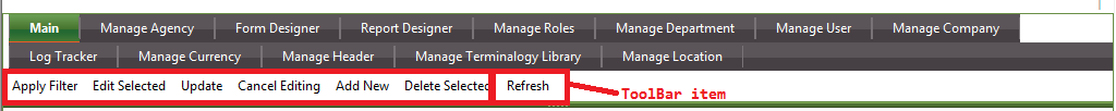 "RadToolBar_ButtonClick" fire this event on radtoolbar button click.<telerik:RadTabStrip ID="rtsActionMenuToolBar" runat="server" MultiPageID="RadMultiPage1" SelectedIndex="0" Style="padding-left: 5px;" ShowBaseLine="true"> </telerik:RadTabStrip> <telerik:RadMultiPage ID="RadMultiPage1" runat="server" Height="100px" SelectedIndex="0" CssClass="MultipageWrapper"> </telerik:RadMultiPage>protected void Page_Load(object sender, EventArgs e) { if (!IsPostBack) { List<ActionMenuToolBarBE> lstActionMenuToolBarBE = new ActionMenuToolBarDomain().SelectActionMenuToolBar(null, null); List<ActionMenuToolBarBE> lstActionMenuToolBarBEParent = lstActionMenuToolBarBE.FindAll(delegate(ActionMenuToolBarBE obj) { return obj.ParentToolBarID == 0; }); foreach (ActionMenuToolBarBE obj in lstActionMenuToolBarBEParent) { RadTab rootTab = new RadTab(); rootTab.Text = obj.ToolBarName; rootTab.Value = obj.ToolBarID.ToString(); rtsActionMenuToolBar.Tabs.Add(rootTab); RadToolBar objRadToolBar = new RadToolBar(); objRadToolBar.AutoPostBack = true; objRadToolBar.CausesValidation = false; objRadToolBar.ButtonClick += new RadToolBarEventHandler(RadToolBar_ButtonClick); List<ActionMenuToolBarBE> lstActionMenuToolBarBEChild = lstActionMenuToolBarBE.FindAll(delegate(ActionMenuToolBarBE objchild) { return objchild.ParentToolBarID == obj.ToolBarID; }); foreach (ActionMenuToolBarBE objChild in lstActionMenuToolBarBEChild) { RadToolBarButton tbb = new RadToolBarButton(); tbb.Text = objChild.ToolBarName; objRadToolBar.Items.Add(tbb); } RadPageView pageView = new RadPageView(); pageView.ID = obj.ToolBarName; pageView.Controls.Add(objRadToolBar); RadMultiPage1.PageViews.Add(pageView); } } } protected void RadToolBar_ButtonClick(object sender, RadToolBarEventArgs e) { string s1 = e.Item.Value; }Regards,