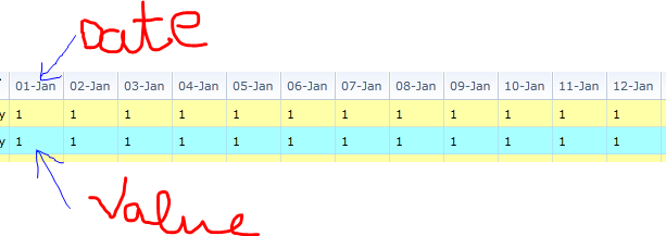the double property is what comes into the column and the datetime property goes as the header