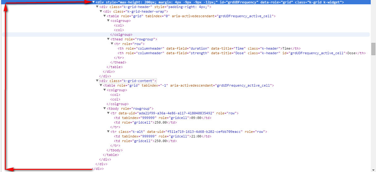 //Find the iFrame FrameInfo frameInfo = new FrameInfo("", "result", "http://fiddle.jshell.net/Rajesh989/vy7earq5/1/show/", 1); ArtOfTest.WebAii.Core.Browser frame = ActiveBrowser.Frames[frameInfo]; //Find the Kendo input HtmlDiv div = frame.Find.ById<HtmlDiv>("Top"); KendoInput input = div.Find.ByAttributes<KendoInput>("class=~k-numerictextbox"); input.Clear(); //Type 500 input.TypeText("500"); HtmlTable table = div.Find.ByAttributes<HtmlTable>("class=~k-focusable"); HtmlTableRow doseRow = table.Find.ByAttributes<HtmlTableRow>("data-id=1"); //Find the second cell of the first row under Dose HtmlTableCell secondCell = doseRow.Cells[1]; secondCell.Focus(); //Wait 2 sec so the cell can be updated System.Threading.Thread.Sleep(2000); //Refresh the cell so the DOM can be refreshed with the correct value. secondCell.Refresh(); //Verify the cell Assert.AreEqual<string>("500.00", secondCell.TextContent); //Click the cell so it can be modidified. secondCell.MouseClick(); System.Threading.Thread.Sleep(2000); secondCell.Refresh(); KendoInput inputEdit = secondCell.Find.ByAttributes<KendoInput>("class=~k-numerictextbox"); inputEdit.Clear(); inputEdit.TypeText("1000");Please notice that you should wait some seconds then refresh the cell so the DOM can be updated.
