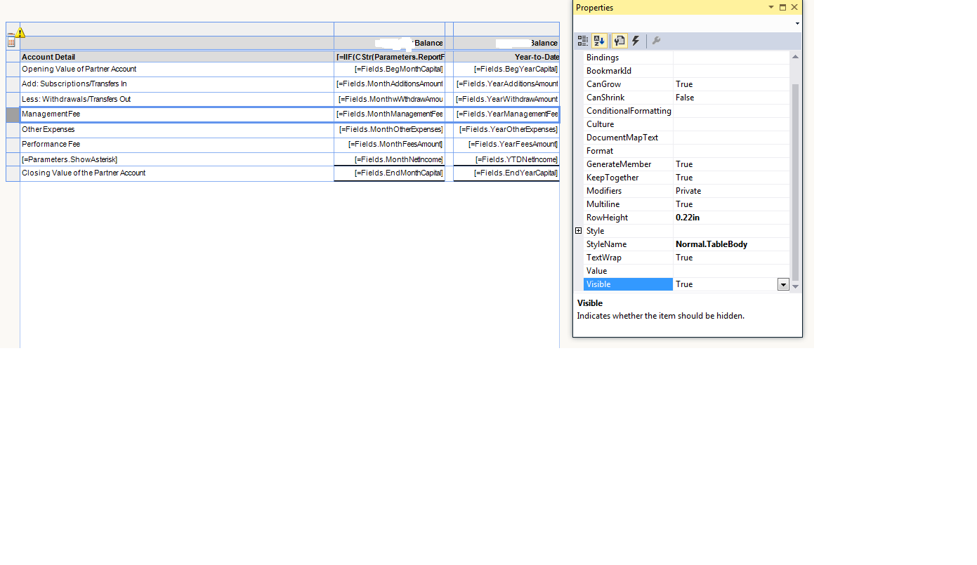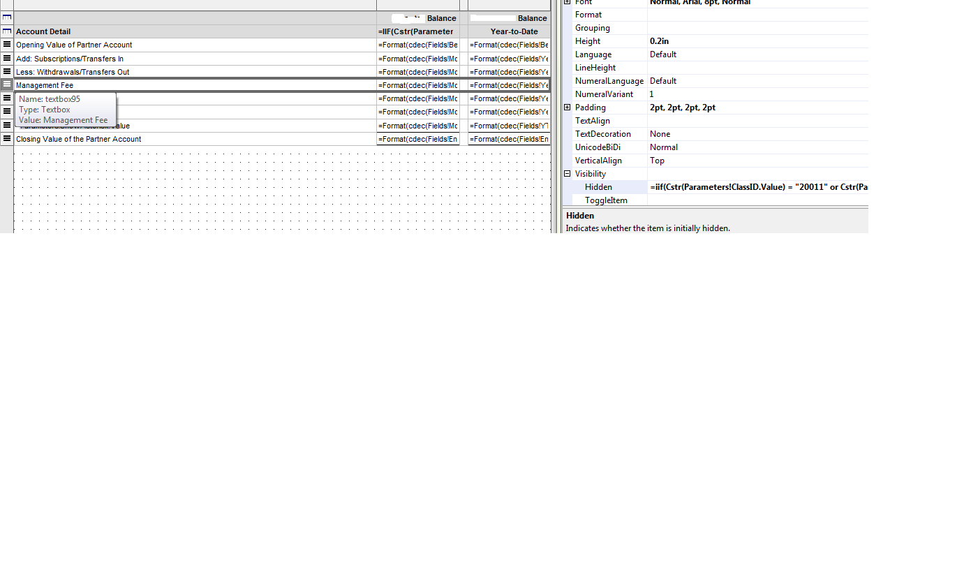 I have a report that has a few sub-reports and these sub-reports have tables in them. Depending on what account is being printed I want to dynamically show and hide specific columns and rows. As of now it appears my only option is to either create multiple table with each possible combination of rows an columns and then hide and show the appropriate table or create multiple sub-reports with each possible combination of rows an columns and then dynamically hide and show the proper sub- report. It would be much nicer if I could create one sub-report with one table and then conditionally hide and show rows and columns, much like how SQL reporting works.