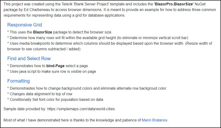 I have created a sample project to demonstrate a number of things I have learned about in working with the Telerik Blazor Grid including how to dynamically set the grid height, responsively add or subtract columns based on media breakpoints, selecting a page and row and how to handle some formatting issues.