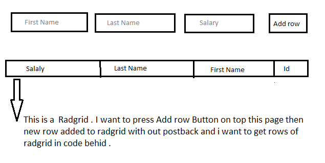 I have to dinamicy add new row to radgrid without postback and i want to access values of rows (radgrid) in code behind .