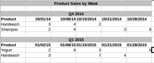 In my report, using Visual Studio designer, I added Quarter, Product to row group, Week to column group and qty Sold to values.
