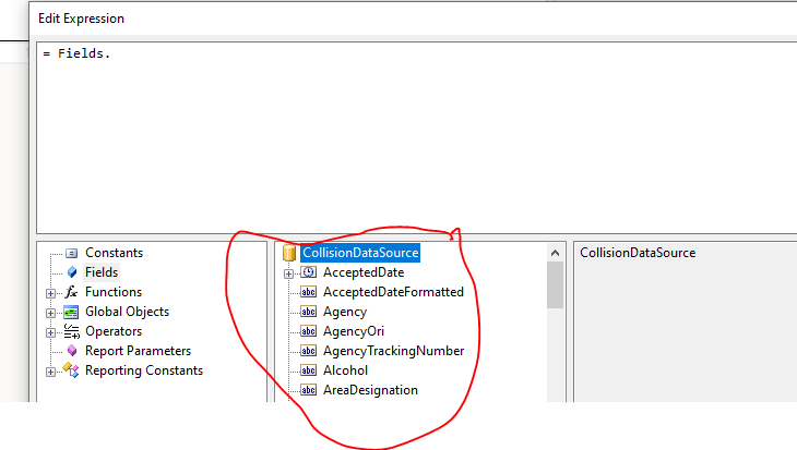 I need to change the datasource for one field in a report. The fields adjacent to the one I want to change have the correct datasource. The datasource in the "Fields" section of the edit expression dialog seems to be read only. How do I change the datasource for that one field?
