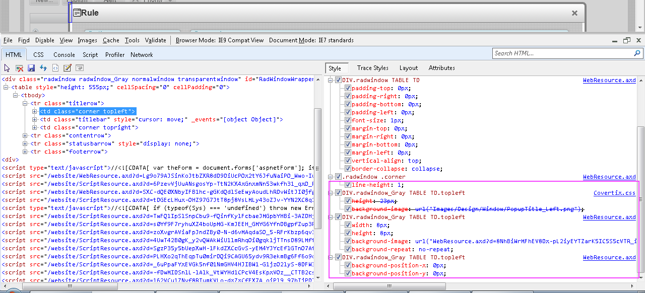 my css is Covertix.css, but the properties are taken from the WebResource.axd file.