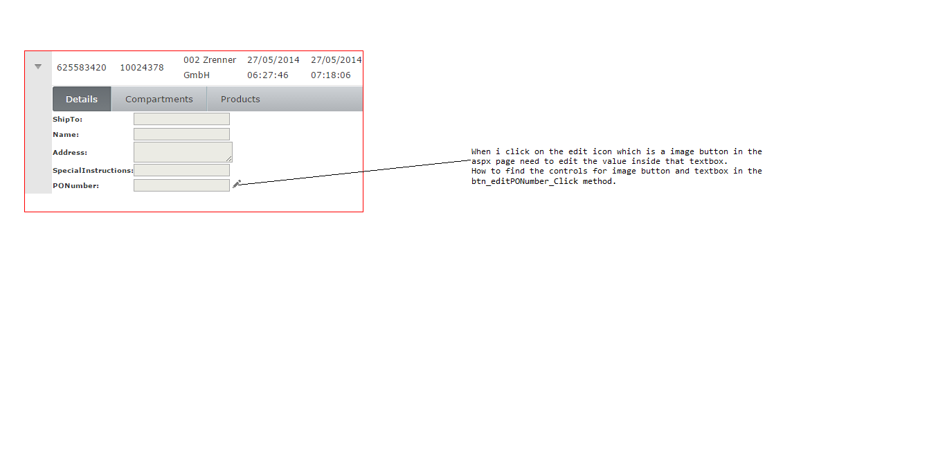 Please check the above code i have written in the btn_editPONumber_Click method.in that method i am unable to the control for the imagebutton and textbox.
