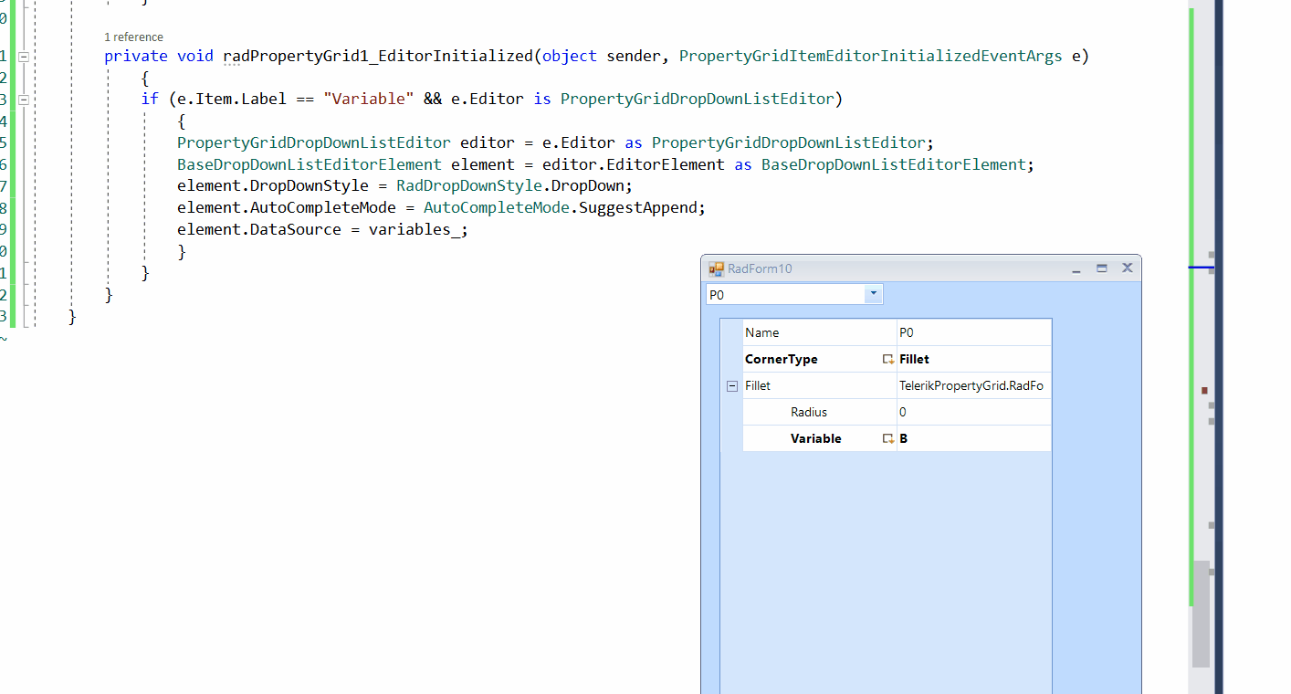 private void radPropertyGrid1_EditorInitialized(object sender, PropertyGridItemEditorInitializedEventArgs e){ PropertyGridDropDownListEditor editor = e.Editor as PropertyGridDropDownListEditor; if (editor != null) { BaseDropDownListEditorElement element = editor.EditorElement as BaseDropDownListEditorElement; element.DropDownStyle = Telerik.WinControls.RadDropDownStyle.DropDown; }}If it is not the exact requirement, please specify in details what is the exact requirement that you are trying to achieve. Thus, we would be able to get better understanding of the precise case and think about a suitable solution.