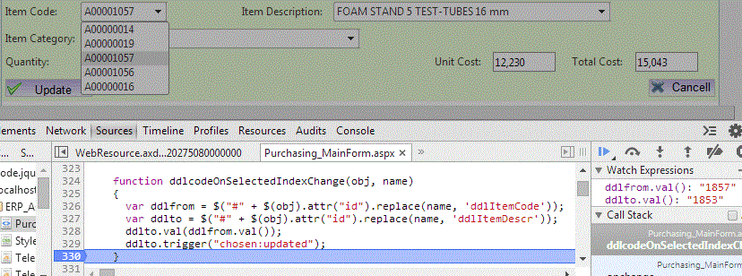 On the shown script, I am trying to synchronize the right list (ddlItemDescr), so it selects the item which is selected on left list (ddlItemCode).