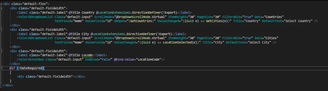 <Customs.UI.Shipments.Components.Common.LocodeComponent DateRequired="true" Title="Collection" Export="@(Shipment.Export)" @bind-CityId="Shipment.CollectionCityId" />
