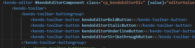 I'm using the kendo-editor to allow a user to write html in a view. I'm trying to get the toolbar buttons grouped by functionality using <kendo-toolbar-buttongroup> tags. But <kendo-toolbar-button> tags that are grouped inside are not showing in the view.