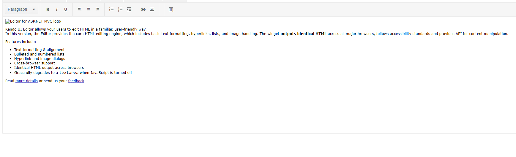 Kendo UI Editor allows your users to edit HTML in a familiar, user-friendly way.<br />
