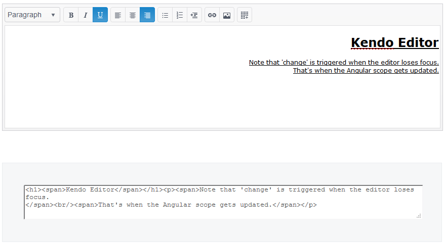 When using the default sanitizer (ngSanitize), certain controls in the Editor do not get echoed back in Angular. See the attached screenshot from the demos page, there is no indication of text align right or of underline.