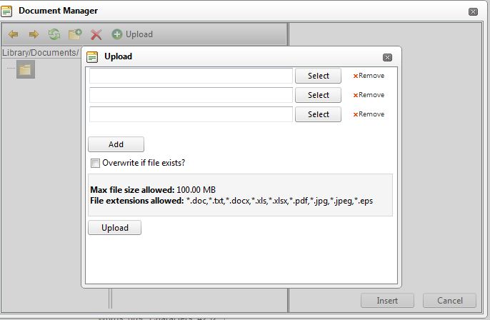 RadEditor _editor = new RadEditor();/*Document Manager*/string documentsPath = "Library/Documents/"; _editor.DocumentManager.UploadPaths = new string[] { documentsPath };_editor.DocumentManager.ViewPaths = new string[] { documentsPath };_editor.DocumentManager.DeletePaths = new string[] { documentsPath };_editor.DocumentManager.SearchPatterns = new string[] { "*.doc,*.txt,*.docx,*.xls,*.xlsx,*.pdf,*.jpg,*.jpeg,*.eps" };_editor.DocumentManager.MaxUploadFileSize = 104857600;It is reading the new extensions allowed, but is neither pulling in the old documents uploaded previously via Document Manager, nor is allowing me to upload any other document. I have attached the screen shots.