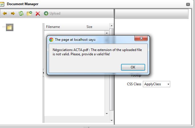 It is reading the new extensions allowed, but is neither pulling in the old documents uploaded previously via Document Manager, nor is allowing me to upload any other document. I have attached the screen shots.
