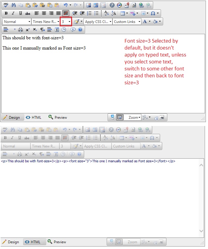 Is there anyway that it shows the default font size = 3, so it should auto append HTML for that font size=3 in the html?