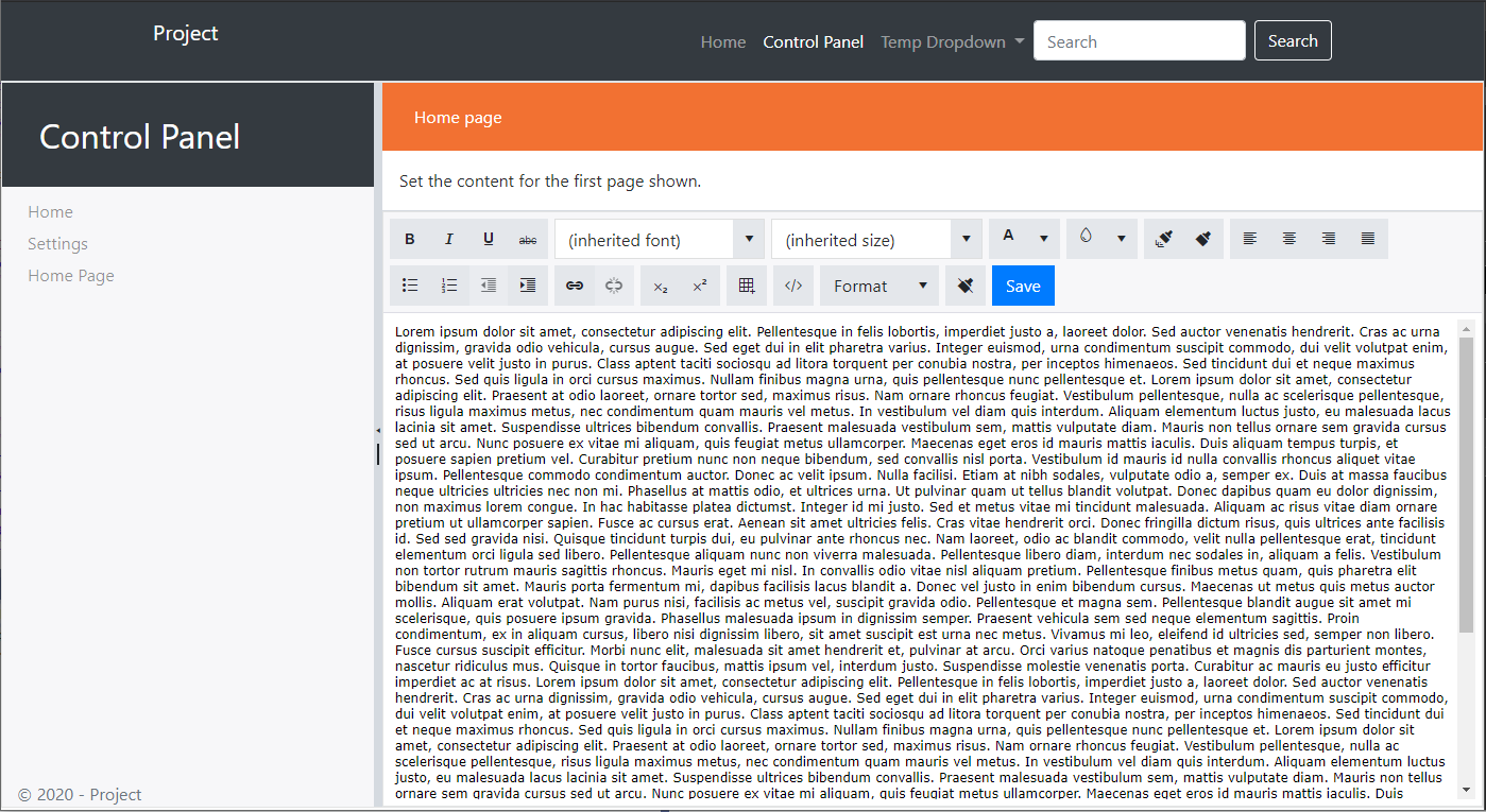 <kendo-splitter name="cp-homepage-splitter" orientation="SplitterOrientation.Vertical" style="height:100%;"> <pane size="115px" collapsible="false" resizable="false" scrollable="false" id="cp-homepage-top-pane"> <p class="iv-title iv-title-2">Home page</p> <p class="alert">Set the content for the first page shown.</p> </pane> <pane collapsible="false" resizable="false" id="cp-homepage-bottom-pane" style="height:100%;overflow-y:hidden;"> <kendo-editor name="HomepageEditor" aria-label="editor" style="height:calc(100% - 0px);"> <resizable enabled="false" /> <tools> <tool name="bold" /> <tool name="italic" /> <tool name="underline" /> <tool name="strikethrough" /> <tool name="fontName" /> <tool name="fontSize" /> <tool name="foreColor" /> <tool name="backColor" /> <tool name="copyFormat" /> <tool name="applyFormat" /> <tool name="justifyLeft" /> <tool name="justifyCenter" /> <tool name="justifyRight" /> <tool name="justifyFull" /> <tool name="insertUnorderedList" /> <tool name="insertOrderedList" /> <tool name="outdent" /> <tool name="indent" /> <tool name="createLink" /> <tool name="unlink" /> <tool name="subScript" /> <tool name="superScript" /> <tool name="tableEditing" /> <tool name="viewHtml" /> <tool name="formatting" /> <tool name="cleanFormatting" /> <tool name="homePageSaveTool" template-id="homePageSaveToolTemplate" /> </tools> <content> <h1>Test</h1> </content> </kendo-editor> </pane></kendo-splitter><script id="homePageSaveToolTemplate" type="text/x-kendo-template"> <button id="saveHomePageBtn" class="k-button k-primary">Save</button></script>