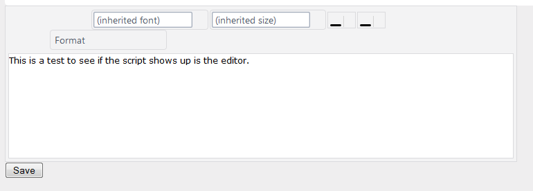 <script type="text/javascript"> $(document).ready(function () { $("#reply").kendoEditor(); });</script><textarea id="reply" rows="10" cols="30" style="width:740px; height="440px"> This is a test to see if the script shows up is the editor. </textarea> <button> Save</button>The toolbar icons rendering is broken....(they have partly rendered??). I tried a 2 other theme files... same issue. I tried specifying the tools collection directly .. No go.. . For the record, I am using Firefox 11.0 browser and a MVC 4 project with the HTML validation target set to XHTML 5.