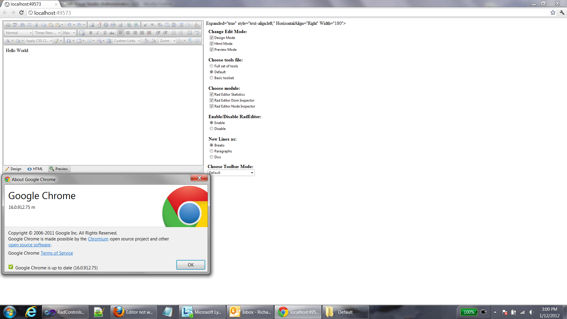We're using version 2011.3.1305.35 of the ASP.Net AJAX controls and the editor doesn't work with Chome 16.0.912.75. We are not able to enter text into the editor.
