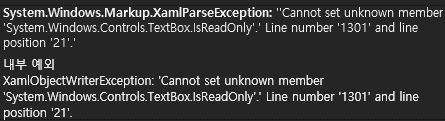 System.Windows.Markup.XamlParseException: ''Cannot set unknown member 'System.Windows.Controls.TextBox.IsReadOnly'.'