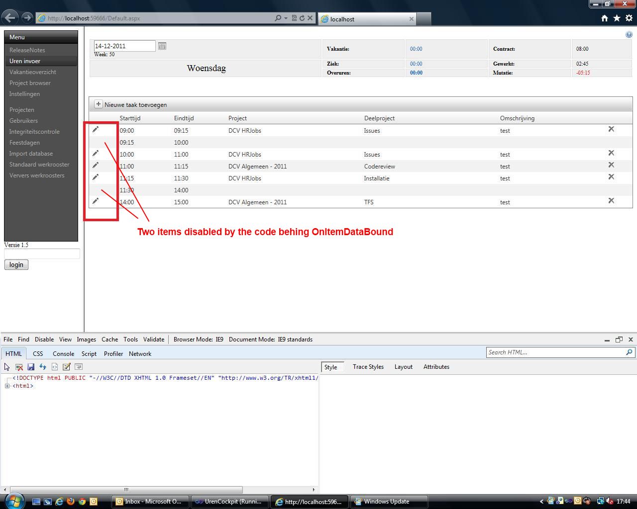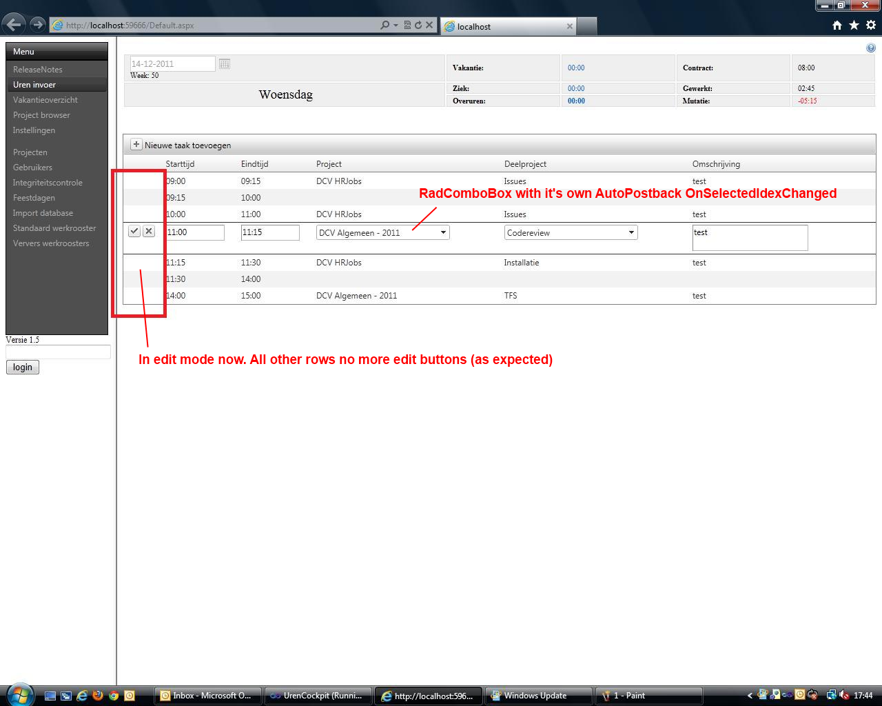 <telerik:RadAjaxManager ID="RadAjaxManager1" runat="server"> <AjaxSettings> <telerik:AjaxSetting AjaxControlID="gridResult"> <UpdatedControls> <telerik:AjaxUpdatedControl ControlID="gridResult" /> <telerik:AjaxUpdatedControl ControlID="lblGewerkt" /> <telerik:AjaxUpdatedControl ControlID="lblZiek" /> <telerik:AjaxUpdatedControl ControlID="lblMutatie" /> <telerik:AjaxUpdatedControl ControlID="txtVakantie" /> <telerik:AjaxUpdatedControl ControlID="txtZiek" /> <telerik:AjaxUpdatedControl ControlID="txtOveruren" /> <telerik:AjaxUpdatedControl ControlID="txtHoursheetsLocal" /> <telerik:AjaxUpdatedControl ControlID="rdpDate" /> </UpdatedControls> </telerik:AjaxSetting> <telerik:AjaxSetting AjaxControlID="rdpDate"> <UpdatedControls> <telerik:AjaxUpdatedControl ControlID="gridResult" /> <telerik:AjaxUpdatedControl ControlID="lblGewerkt" /> <telerik:AjaxUpdatedControl ControlID="lblZiek" /> <telerik:AjaxUpdatedControl ControlID="lblMutatie" /> <telerik:AjaxUpdatedControl ControlID="txtVakantie" /> <telerik:AjaxUpdatedControl ControlID="txtZiek" /> <telerik:AjaxUpdatedControl ControlID="txtOveruren" /> <telerik:AjaxUpdatedControl ControlID="lblWeek" /> <telerik:AjaxUpdatedControl ControlID="lblDag" /> <telerik:AjaxUpdatedControl ControlID="lblBlocked" /> </UpdatedControls> </telerik:AjaxSetting> <telerik:AjaxSetting AjaxControlID="cmbProjects"> <UpdatedControls> <telerik:AjaxUpdatedControl ControlID="gridResult" /> </UpdatedControls> </telerik:AjaxSetting> </AjaxSettings> </telerik:RadAjaxManager> <!-- /RadAjaxManager --> <!-- daysheet !--> <table width="100%" class="ShowValueTable"> <tr> <td class="contents"> <telerik:RadDatePicker runat="server" ID="rdpDate" DateInput-DateFormat="dd-MM-yyyy" Culture="nl-NL" OnSelectedDateChanged="rdpDate_SelectedDateChanged" Enabled="true"> <DatePopupButton runat="server" /> <Calendar ID="Calendar1" runat="server" /> <DateInput ID="DateInput1" runat="server" AutoPostBack="true" DateFormat="dd-MM-yyyy" DisplayDateFormat="dd-MM-yyyy"> <IncrementSettings InterceptMouseWheel="false" /> </DateInput> </telerik:RadDatePicker> <asp:Label runat="server" ID="lblWeek" /> </td> <td class="label"> Vakantie: </td> <td class="contents"> <asp:LinkButton runat="server" CausesValidation="false" ID="txtVakantie" OnClientClick="openWindowMutation"></asp:LinkButton> </td> <td class="label"> Contract: </td> <td class="contents"> <asp:Label runat="server" ID="lblContract" /> </td> </tr> <tr> <td class="contents" rowspan="2" style="text-align: center; font-size: 14pt;"> <asp:Label runat="server" ID="lblDag" /> <asp:Label runat="server" ID="lblBlocked" Font-Size="10pt" Style="color: Red;" /> </td> <td class="label"> Ziek: </td> <td class="contents"> <asp:LinkButton runat="server" CausesValidation="false" ID="txtZiek" OnClientClick="openWindowMutation"></asp:LinkButton> </td> <td class="label"> Gewerkt: </td> <td class="contents"> <asp:Label runat="server" ID="lblGewerkt" /> </td> </tr> <tr> <td class="label"> Overuren: </td> <td class="label"> <asp:LinkButton runat="server" CausesValidation="false" ID="txtOveruren" OnClientClick="openWindowMutation"></asp:LinkButton> </td> <td class="label"> Mutatie: </td> <td class="contents"> <asp:Label runat="server" ID="lblMutatie" /> <asp:Label runat="server" ID="lblMaxZiek" Style="display: none;" /> </td> </tr> </table> <!-- /daysheet !--> <br /> <br /> <!-- hoursheet !--> <telerik:RadGrid runat="server" ID="gridResult" AutoGenerateColumns="False" OnItemDataBound="gridResult_ItemDataBound" OnUpdateCommand="gridResult_UpdateCommand" OnDeleteCommand="gridResult_DeleteCommand" OnInsertCommand="gridResult_InsertCommand" OnNeedDataSource="gridResult_NeedDataSource" OnItemCommand="gridResult_ItemCommand" EnableViewState="true"> <MasterTableView TableLayout="Fixed" DataKeyNames="OID" EditMode="InPlace" CommandItemDisplay="Top" InsertItemDisplay="Bottom" NoMasterRecordsText="Geen taken om weer te geven"> <CommandItemSettings AddNewRecordText="Nieuwe taak toevoegen" ShowRefreshButton="false" /> <SortExpressions> <telerik:GridSortExpression FieldName="Starttijd" SortOrder="Ascending" /> </SortExpressions> <Columns> <telerik:GridEditCommandColumn ButtonType="ImageButton" UniqueName="EditCommandColumn"> <ItemStyle CssClass="MyImageButton" VerticalAlign="Top" /> <HeaderStyle Width="5%"></HeaderStyle> </telerik:GridEditCommandColumn> <telerik:GridBoundColumn UniqueName="OID" DataField="OID" HeaderText="OID" Visible="false" /> <telerik:GridTemplateColumn HeaderText="Starttijd" UniqueName="Starttijd" AllowFiltering="false" HeaderStyle-Width="10%" ItemStyle-VerticalAlign="Top"> <ItemTemplate> <asp:Label ID="lblStartTijd" Text='<%# bind("Starttijd") %>' runat="server" /> </ItemTemplate> <EditItemTemplate> <telerik:RadMaskedTextBox runat="server" SelectionOnFocus="SelectAll" ID="txtStarttijd" Text='<%# bind("Starttijd") %>' Mask="<0..23>:<0..59>" Width="85%"> <ClientEvents OnBlur="BlurStarttijd" OnLoad="InitStarttijd" /> </telerik:RadMaskedTextBox> </EditItemTemplate> <InsertItemTemplate> <telerik:RadMaskedTextBox runat="server" SelectionOnFocus="SelectAll" ID="txtStarttijd" Text='<%# bind("TempStartTime") %>' Mask="<0..23>:<0..59>" Width="85%"> <ClientEvents OnBlur="BlurStarttijd" OnLoad="InitStarttijd" /> </telerik:RadMaskedTextBox> </InsertItemTemplate> </telerik:GridTemplateColumn> <telerik:GridTemplateColumn HeaderText="Eindtijd" UniqueName="Eindtijd" AllowFiltering="false" HeaderStyle-Width="10%" ItemStyle-VerticalAlign="Top"> <ItemTemplate> <asp:Label ID="lblEindTijd" Text='<%# bind("Eindtijd") %>' runat="server" /> </ItemTemplate> <EditItemTemplate> <telerik:RadMaskedTextBox runat="server" ID="txtEindtijd" Text='<%# bind("Eindtijd") %>' Mask="<0..23>:<0..59>" Width="85%"> <ClientEvents OnBlur="BlurEindtijd" OnLoad="InitEindtijd" /> </telerik:RadMaskedTextBox> <asp:CustomValidator ID="CustomValidator1" runat="server" ErrorMessage="Starttijd mag niet plaatsvinden na eindtijd" Text="*" ClientValidationFunction="compareTime" ControlToValidate="txtEindtijd" SetFo