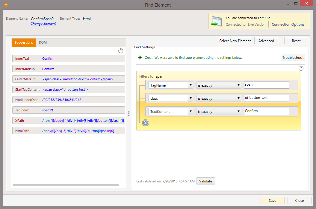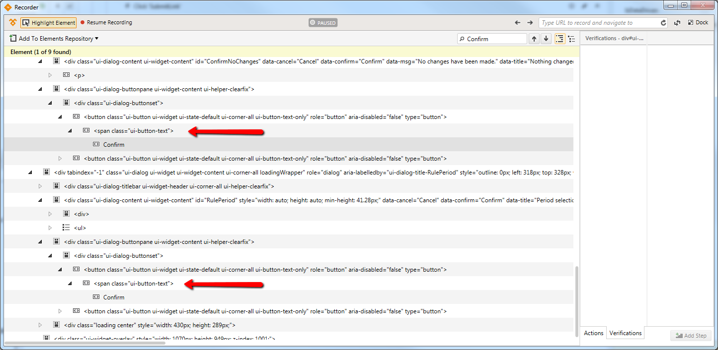 I have recorded a web action which validates an element with TagIndex (picture Original.Element), which works OK. But since the element index changes from time to time, I change the validation to be more general. I have used suggested elements (picture Modified.Element) and validation process was successful in the live view mode. But when I execute the test, the element (button Confirm) is not selected. I have enclosed test scenario (WebTest.Updated) for the replication.