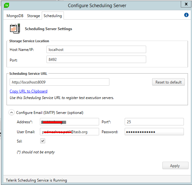 As a next step in this conversation I will describe the necessary settings for the email notifications. You seemed to have set already the required details for the SMTP server in the Scheduling configuration wizard (please refer to the screenshot you have attached in the initial post). However, I suspect that the port listed there will not work with the current details. What I mean is that you have checked the 'SSL' checkbox and thus the appropriate port should be 456. Can you please verify with the responsible team on your end which should be the correct port to use to connect to the SMTP server and set that one accordingly in the Scheduling wizard?