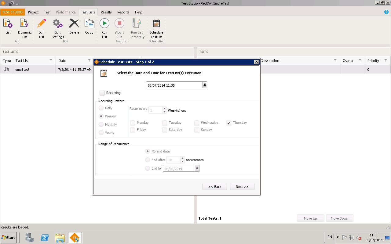 Connect your test project to this remote scheduling server. Now when you schedule a test list it will run on this remote machine which should be running 24 x 7. You can now shutdown your local desktop/laptop, go home and the test will run at the scheduled time. If you set it up right you will get an email with the results. You can also start Test Studio back up, go to the Results tab and fetch the results from the remote storage service (results of the test run are pushed and save in our storage service).